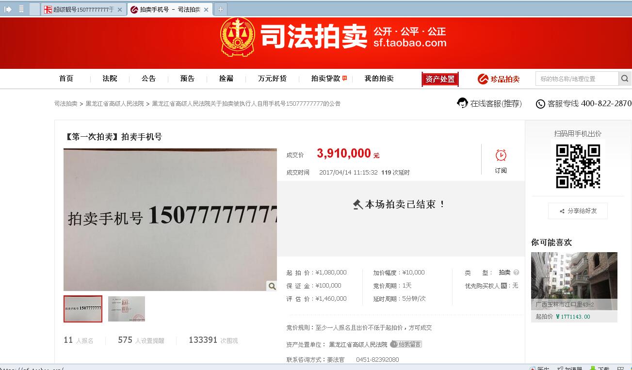 15077777777淘宝司法拍卖已拍到391万,已尘埃落定,现隆重推出: